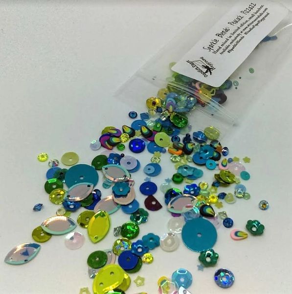 Peacock Pizzazz has the perfect blends of blues, greens and just a touch of plum with cupped, flower, paisley, and almond shaped sequins, iridescent crystals, seed beads & multicolored peacock feather Fimo shapes.