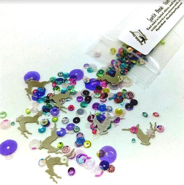 with a scattering of crystals in fuchsia, lavender, mint & blue.